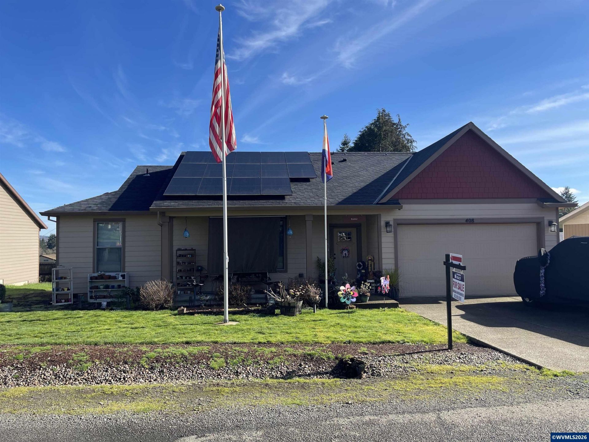Custom single-level home in the heart of Willamina! This 3BD/2BA home features an open floor plan with vaulted ceilings and abundant natural light. Spacious kitchen offers stainless steel appliances, ample counter space, and flows seamlessly into the dining and living areas. Living room includes a cozy fireplace and large windows. Primary suite features a walk-in closet and private bath. Two additional bedrooms provide flexibility for guests, office, or hobbies. Enjoy outdoor living with a covered deck off the dining room???perfect for entertaining???as well as a covered front porch. Large, partially fenced backyard offers room to garden, play, or relax. Two-car attached garage plus RV parking with 110/220 hookup. Solar panels add energy efficiency and long-term savings. Convenient one-level living close to town amenities.